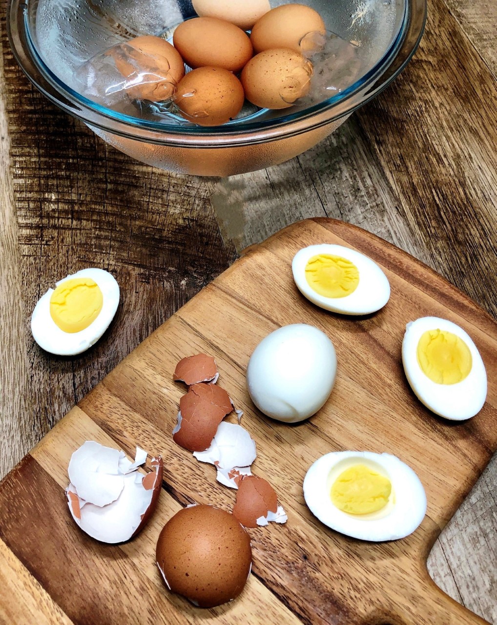 - Transfer the eggs to the bowl of ice water and leave them there for at least 3 minutes.